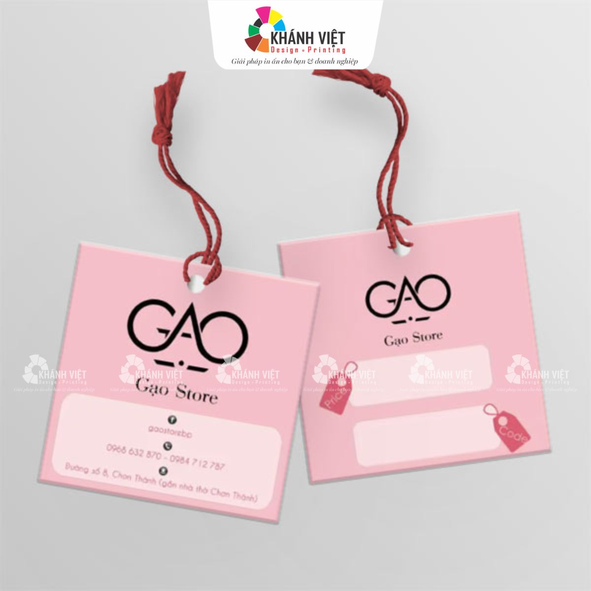 - Nội dung: Nên chú ý làm nổi bật các thông tin quan trọng như logo thương hiệu. Có thể ép kim, dập chìm, dập nổi, vừa tăng cảm giác khi chạm vào vừa giúp nâng tầm thẩm mỹ cho tag treo và sản phẩm.