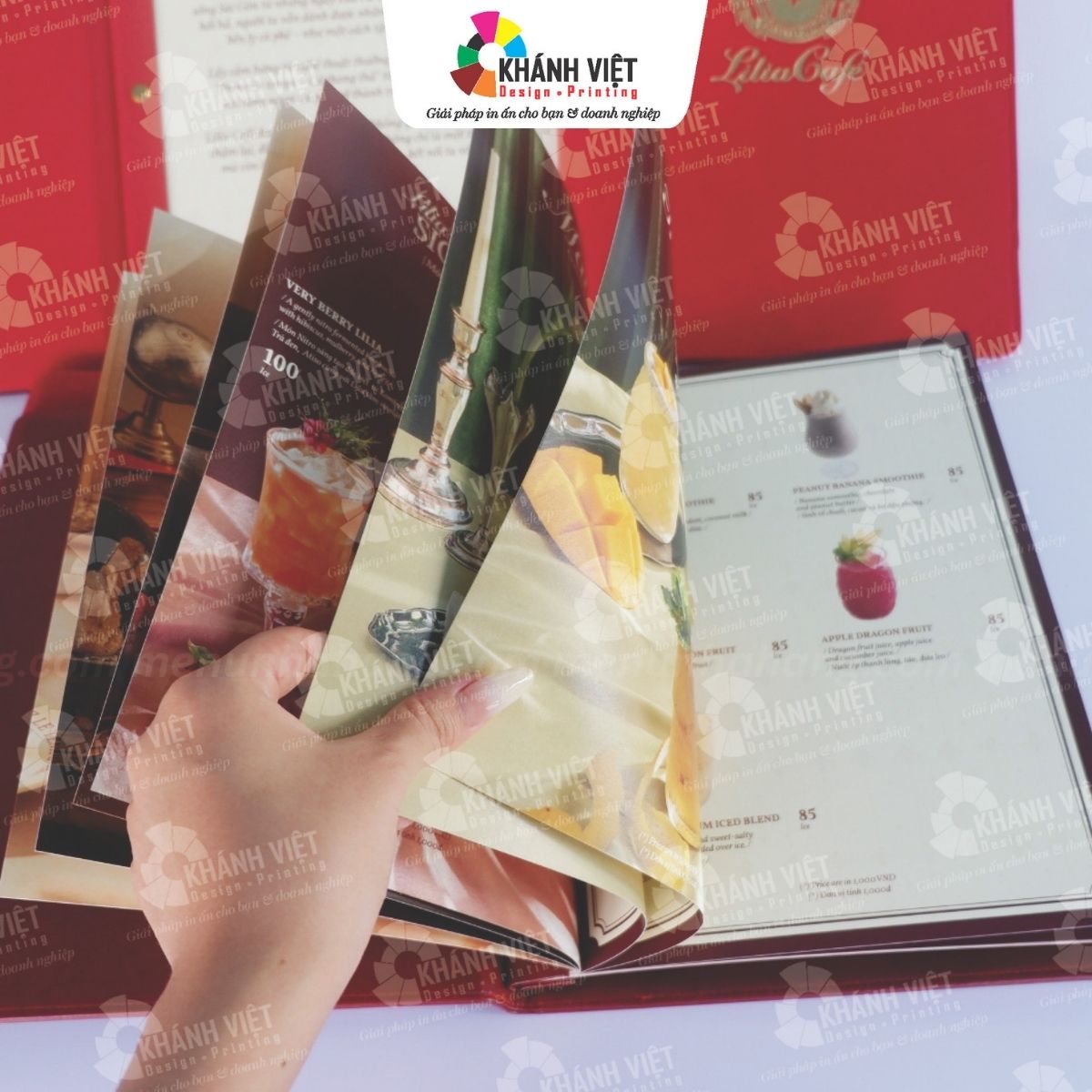 - Menu đóng cuốn/quyển: Loại này gồm nhiều tờ, thường được đóng gáy lò xo hoặc gáy keo. Ưu điểm là chứa được nhiều thông tin, trông sang trọng và rất bền bỉ.