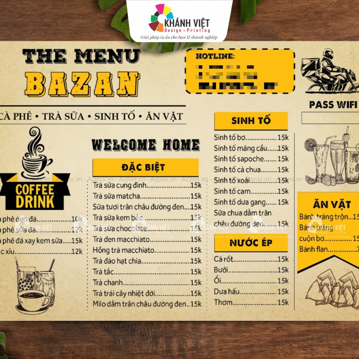 - Chất lượng thiết kế và bố cục: Thiết kế phải có bố cục rõ ràng, hình ảnh thức uống phải sắc nét, font chữ phải dễ đọc (đảm bảo tính dễ đọc), và màu sắc in ra phải đồng nhất với nhận diện thương hiệu. Đây là bước đầu tiên và quan trọng nhất.